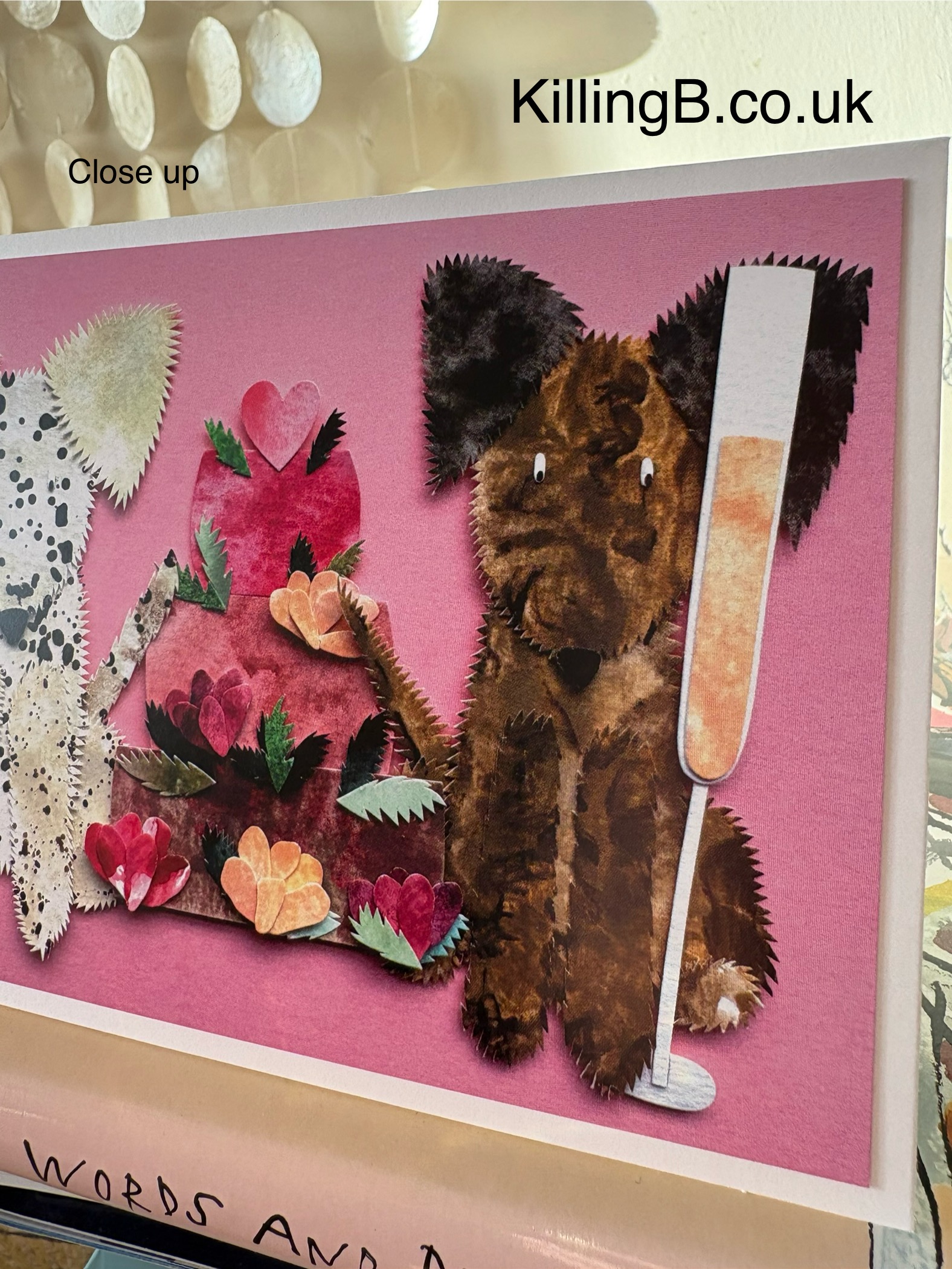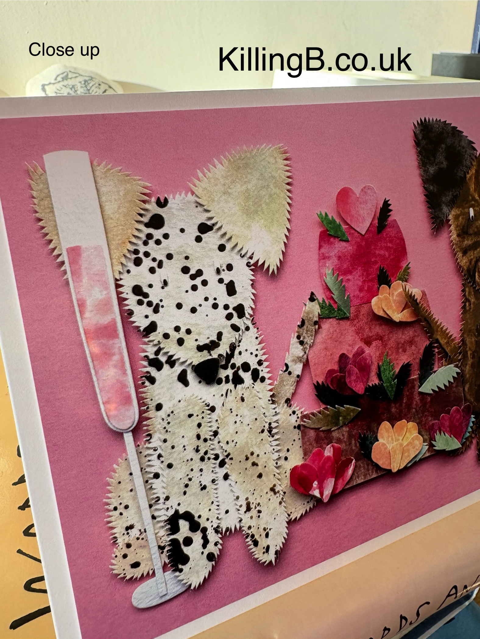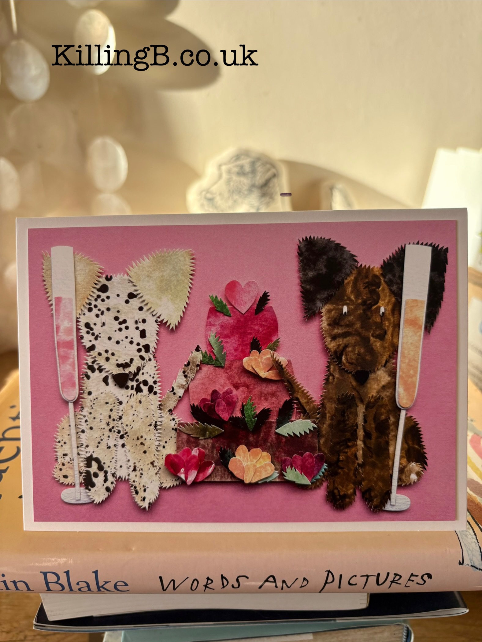 Description: This speckled dog (you can make out the eyes peeping out of the dots if you look hard enough!) and brown dog are in a very agreeable situation with tall thin flutes of rose and peach bellini in their paws, either side of a delicious three-tiered fruity, floral cake to celebrate something fantastic!