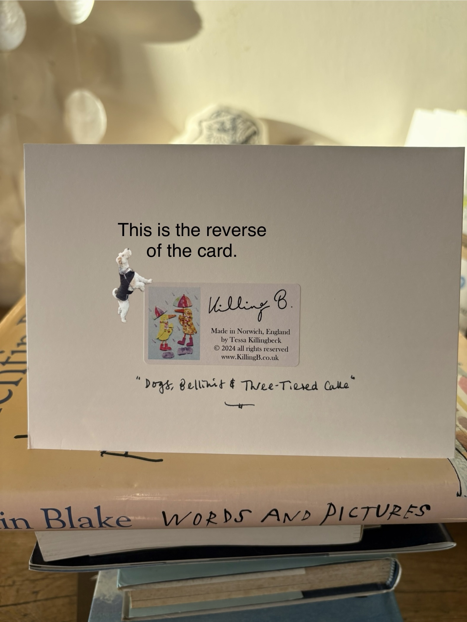 NB. Tobin in his rain jacket is the wire fox terrier standing up inspecting the the view, on the ‘reverse of card’ sticker.